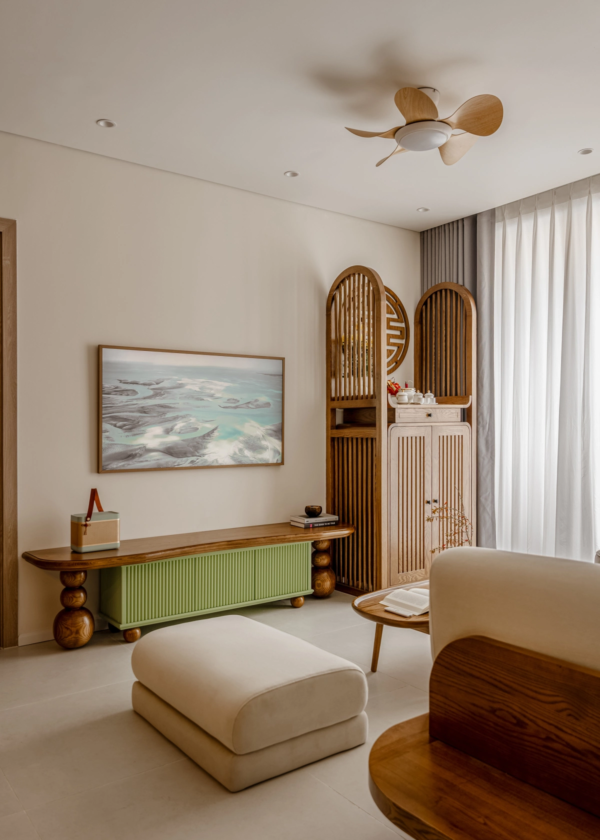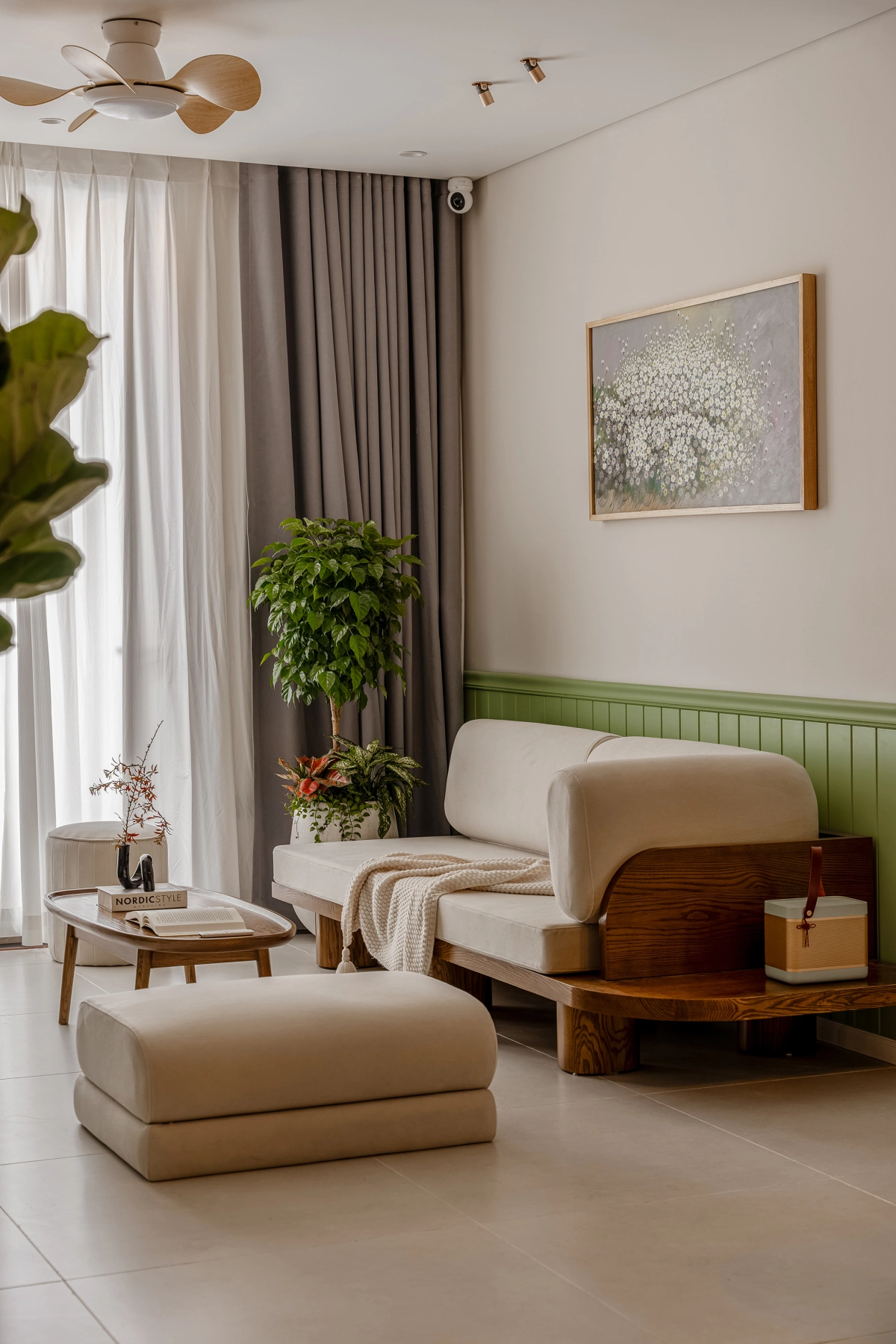 Phòng khách nhỏ gọn, mang tone màu chủ đạo là trắng kem, nâu gỗ, nhấn nhá các chi tiết xanh olive.