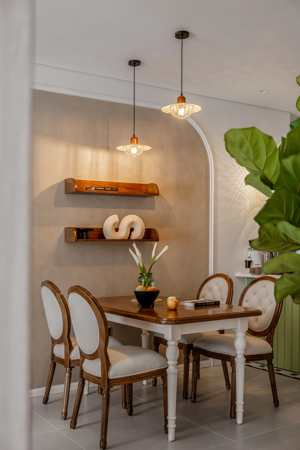Bàn ăn với thiết kế mang đậm màu sắc farmhouse, nổi bật ở hệ chân bàn ghế lạ mắt, có bổ sung đèn thả và kệ trang trí.
