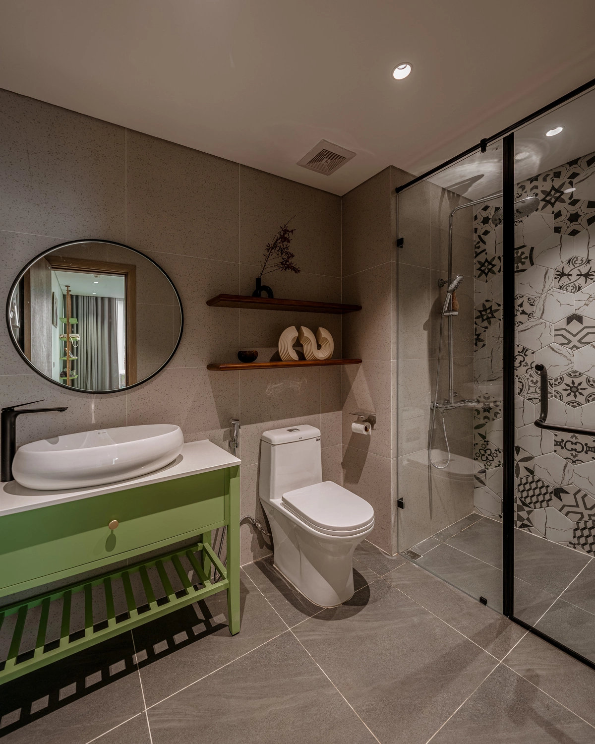 Phòng vệ sinh với tone màu olive đồng nhất với thiết kế chung của toàn căn hộ.