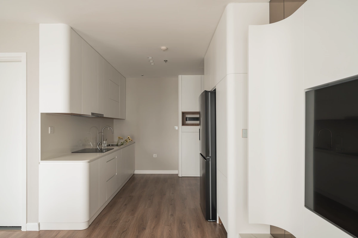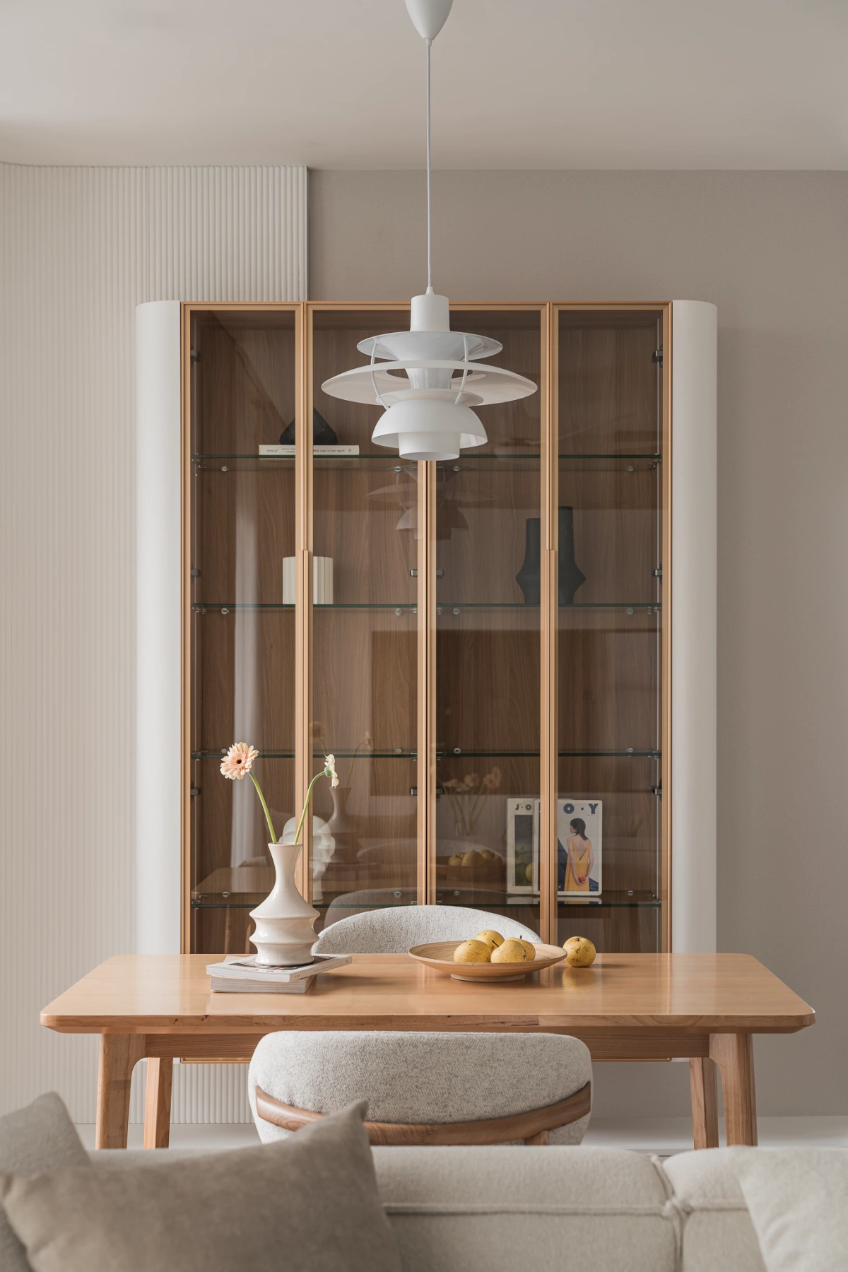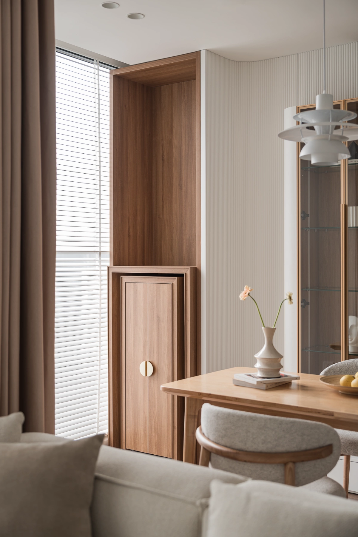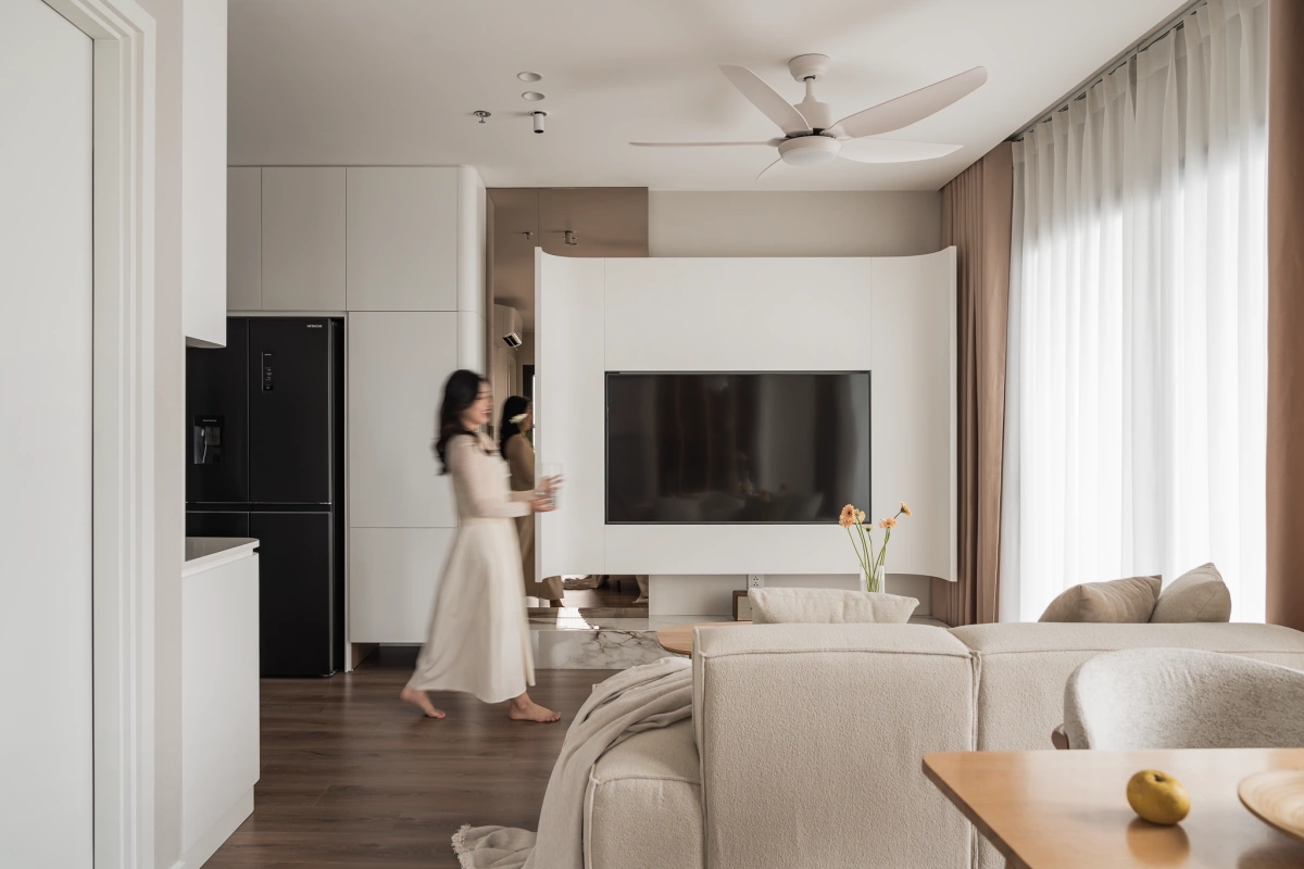 Một trong những giải pháp hiệu quả là áp dụng phong cách hiện đại, tối giản với tông màu trắng chủ đạo, kết hợp chất liệu gỗ tự nhiên. Từng góc nhỏ trong căn hộ đều được tận dụng để bố trí đồ dùng theo nhu cầu thực tế của gia chủ.