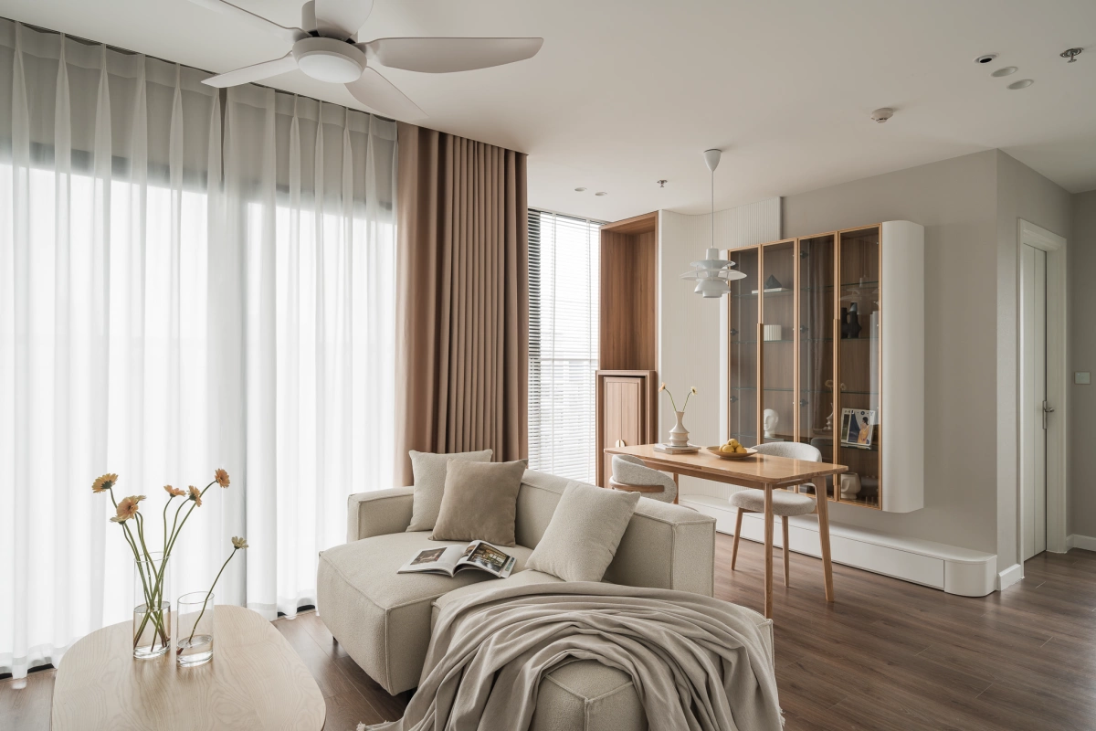 Căn hộ có diện tích 64 m2 với công năng chính gồm một phòng khách, bếp – ăn, một phòng ngủ, một phòng làm việc và hai nhà vệ sinh. Phong cách thiết kế căn hộ kết hợp giữa hiện đại, tối giản và cảm hứng Nhật Bản (Japandi), nhằm hướng đến không gian sống thoáng đãng, ấm cúng.