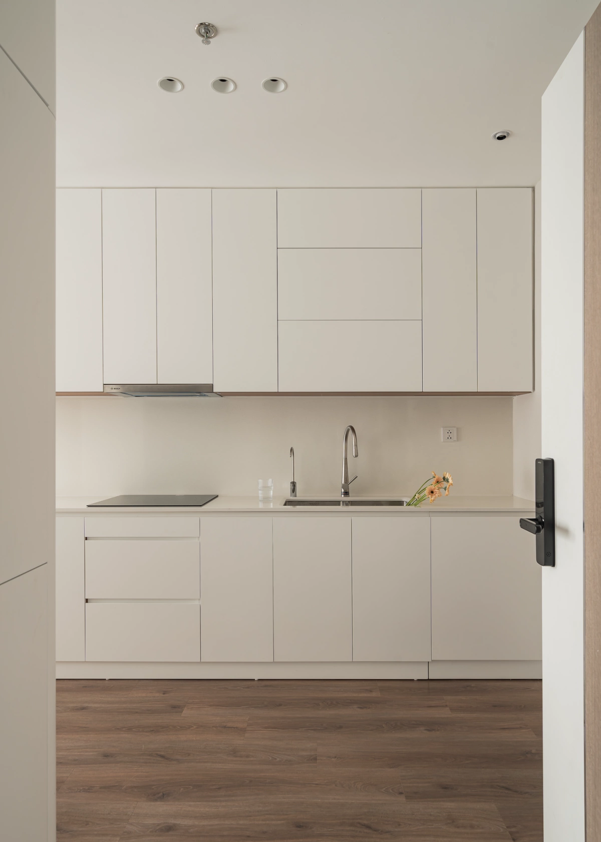 Hệ tủ bếp màu trắng được thiết kế gọn gàng với đầy đủ công năng, giúp tạo cảm giác rộng rãi cho căn bếp.
