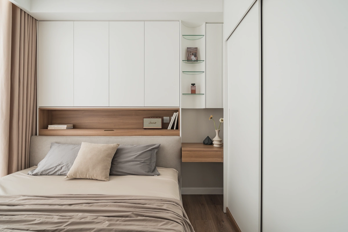 Phòng ngủ được tối ưu hóa với các giải pháp lưu trữ thông minh gồm hệ tủ kệ liền tường, giúp tận dụng không gian một cách hiệu quả.