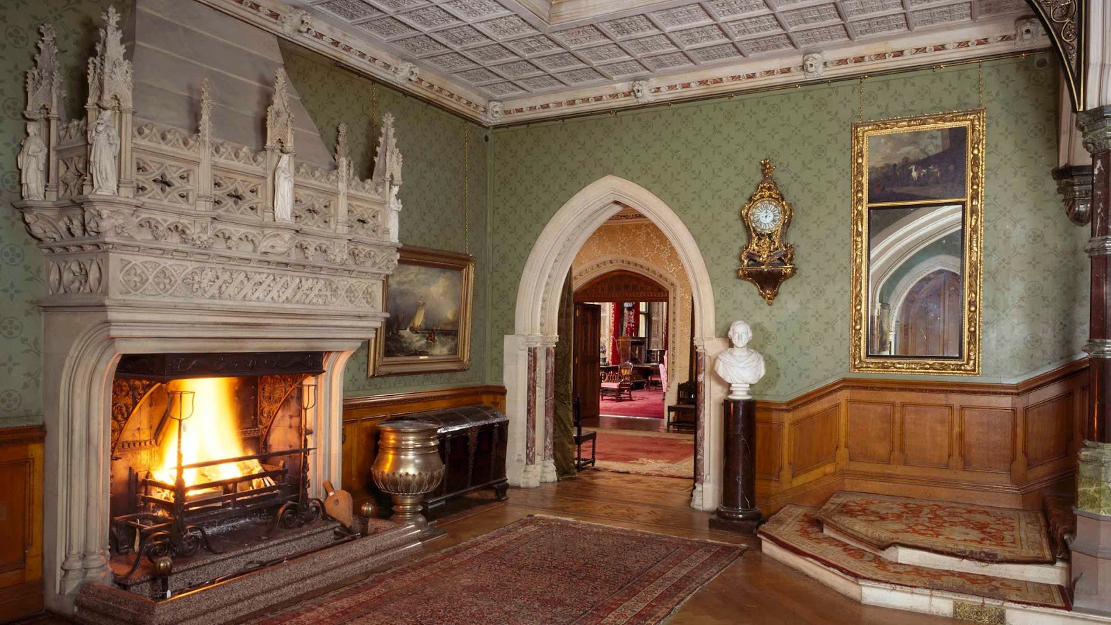 Bên trong các công trình Gothic Revival là một thế giới đậm chất cổ điển và huyền bí. Không gian nội thất thường sử dụng gam màu tối như nâu sẫm, đỏ đô, tím than hoặc đen, tạo nên bầu không khí trang nghiêm và sâu lắng.