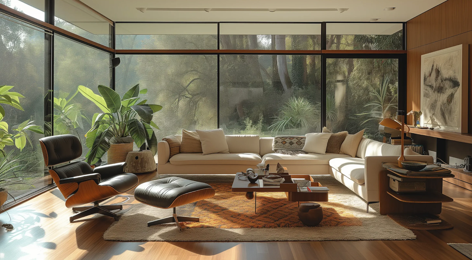 Một đặc trưng không thể thiếu của Mid-Century Modern là sự ưu tiên ánh sáng tự nhiên và kết nối không gian trong – ngoài. Các bức tường kính lớn từ sàn đến trần, sân trong (courtyard) và cách bố trí mở giúp xóa mờ ranh giới giữa con người và thiên nhiên.
